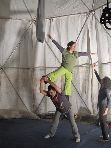 אה, אנחנו לא מחפשים פרנסה מהקרקס… אנחנו עושים את הקרקס רק לכיף שלנו והופעות ביומולדת של הילדים שלנו. יש לנו גן ילדים פרטי שאני מאד אוהבת וגם הם זוכים לראות אותנו מתהפכים ועושים תרגילים במסיבות של הגן, וממש עכשיו יש לנו אחת כזו..